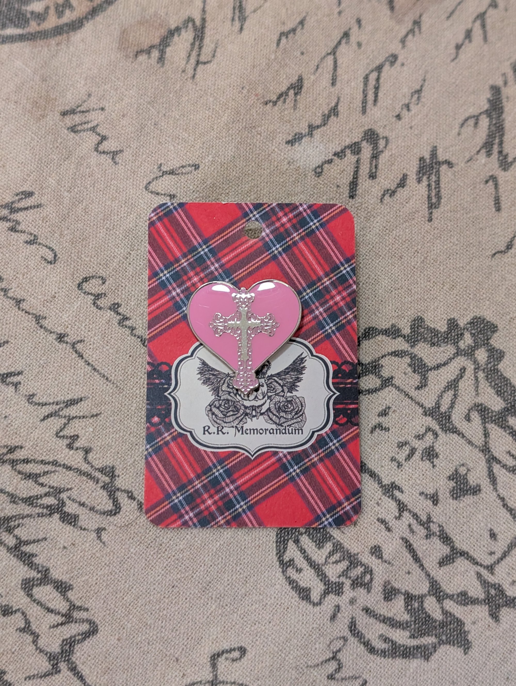 Pink enameled heart with a silver filigree cross in the center.
