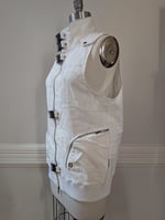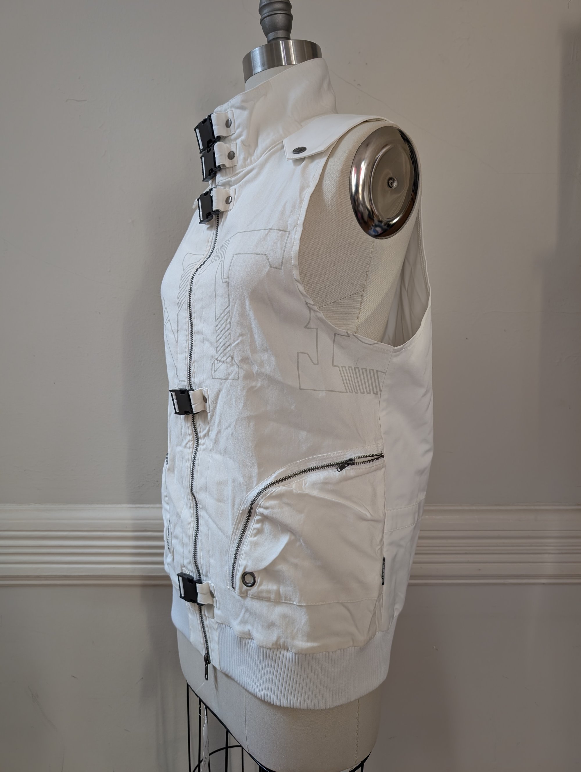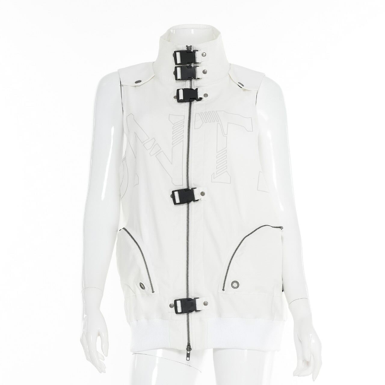 This vest is covered in hardware giving it a very cyber-punk vibe. Has a screen print with some of the letters of the Ozzon sub lable Conte in a subtle shade of grey across the chest.
